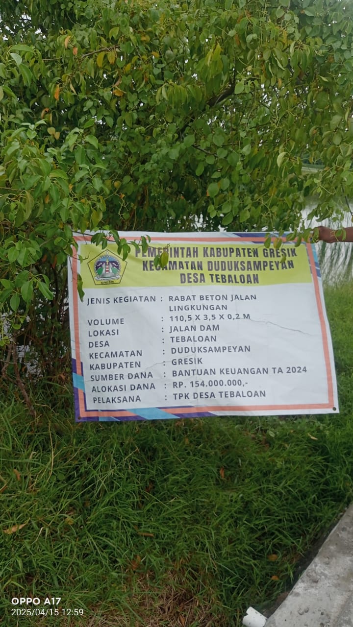 Andi selaku kepala desa Tebaloan saat dikonfirmasi awak media di ruangan kerjanya pada tanggal 15 April 2025, saat ditanya mengenai pembangunan rabat beton anggaran BK tahun 2024 beliaunya mengatakan kalau pembangunan tersebut sudah terealisasi dan sudah dimonep oleh pihak kecamatan Duduksampeyan.