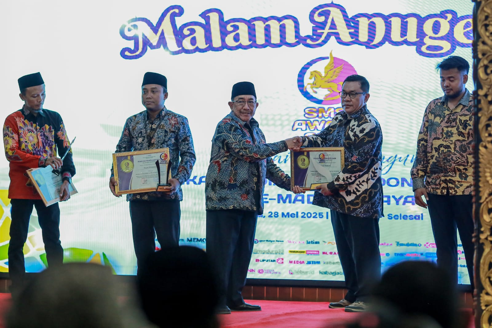 Hadir langsung menerima penghargaan SMSI Award 2025, dengan kategori “Kampus Kreatif Penguat Budaya Lokal Berjejaring Internasional”, Rektor UNIBA Madura, Prof Rachmad Hidayat, didampingi Warek Budyi Suswanto.