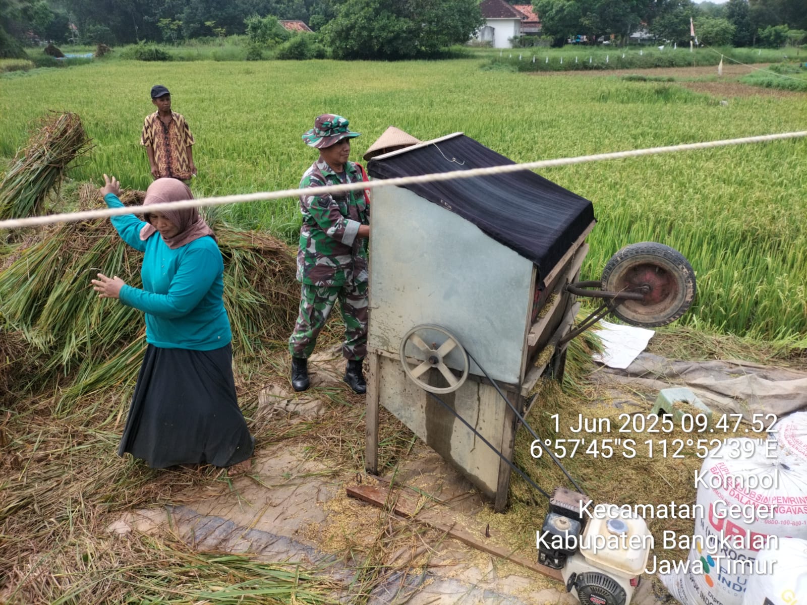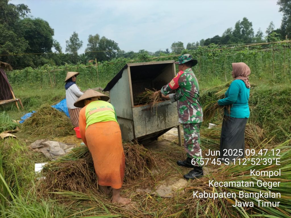 Babinsa Koramil 0829-15/Geger Laksanakan Pendampingan Panen Padi Bersama Petani di Desa Kompol