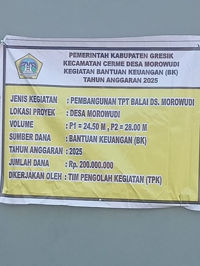 Salah satu proyek TPT (tembok penahan tanah) yang ada di depan balai Desa Morowudi kecamatan Cerme ini nampak terlihat batu yang lama masih dipakai kembali padahal di dalam aturan itu tidak di perbolehkan karena jenis kegiatannya itu pembangunan, tapi di Desa Morowudi aturan itu tidak berguna karena walau sudah tau aturannya, pembangunan tetap di laksanakan menggunakan batu yang lama.