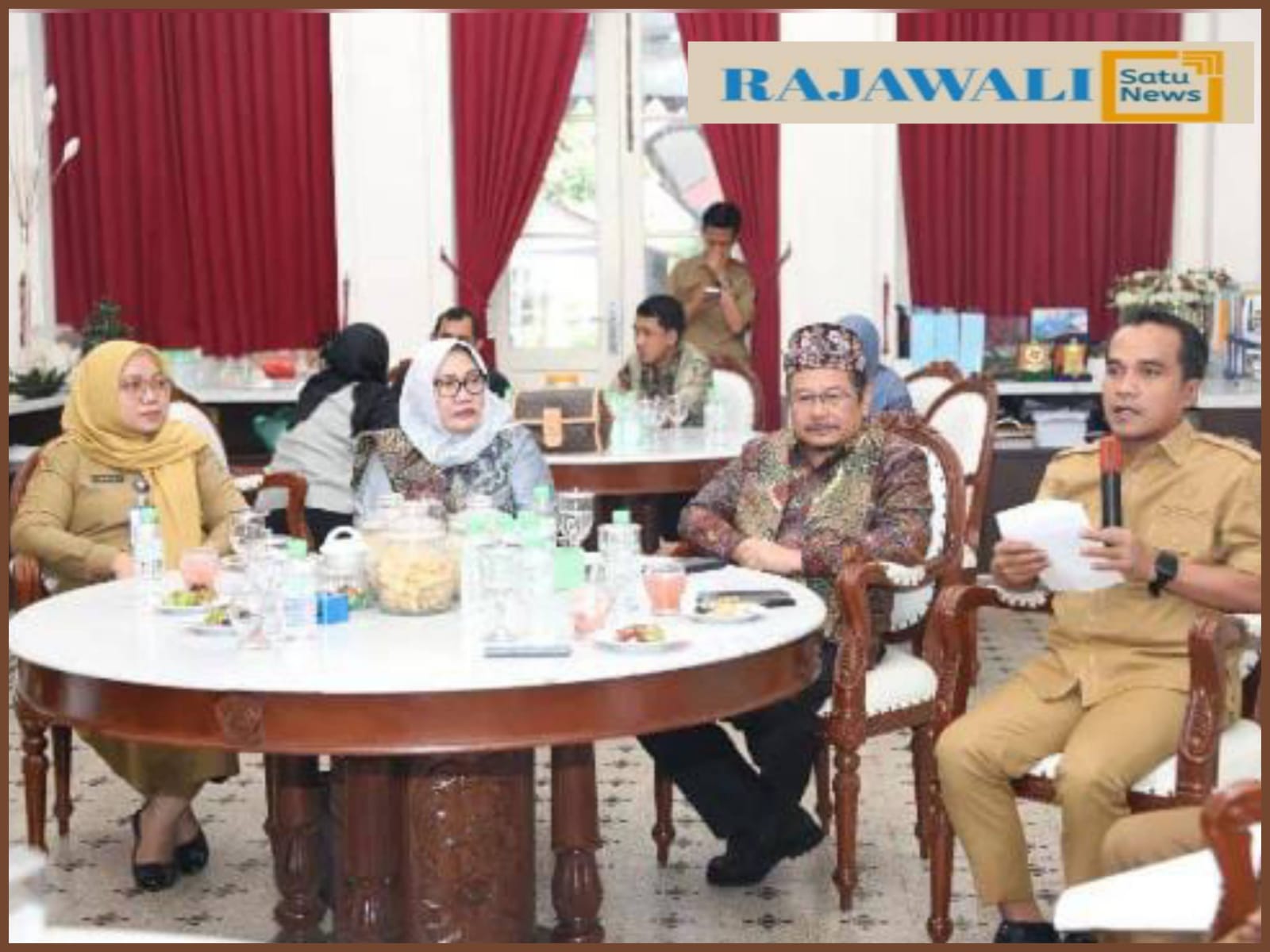 Momen penyambutan berlangsung hangat. Bupati Lukman bahkan memasangkan tongkos (ikat kepala khas Madura) kepada Kepala Badan Riset dan Inovasi Daerah (Brida) Provinsi Jawa Timur, Dr. Andriyanto, SH, M.Kes, sebagai simbol penghormatan dan penerimaan tamu kehormatan.