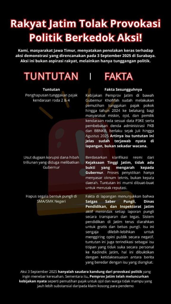 Adik menilai, klaim-klaim negatif yang melatarbelakangi rencana aksi 3 September bersifat kontraproduktif. “Tidak ada alasan bagi masyarakat melakukan hal-hal yang justru mengganggu stabilitas. Jawa Timur sudah terbukti mampu bertahan dan memulihkan ekonomi lebih cepat dibanding provinsi lain,” ujarnya.