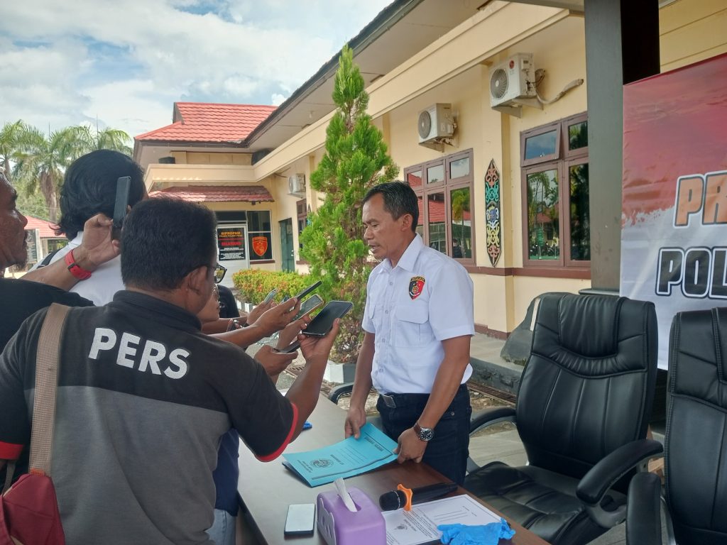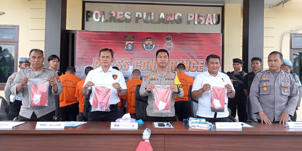Kapolres Pulang Pisau AKBP Iqbal Sengaji, didampingi Kasat Narkoba AKP Waryoto, Kasatreskrim AKP Sugiharso, Kasi Humas Iptu Sabilil Fitri, dan Kapolsek Pandih Batu Iptu Sutarman, memaparkan hasil ungkap kasus tersebut dalam konferensi pers di Mapolres hari Jumat (12/9/2025).