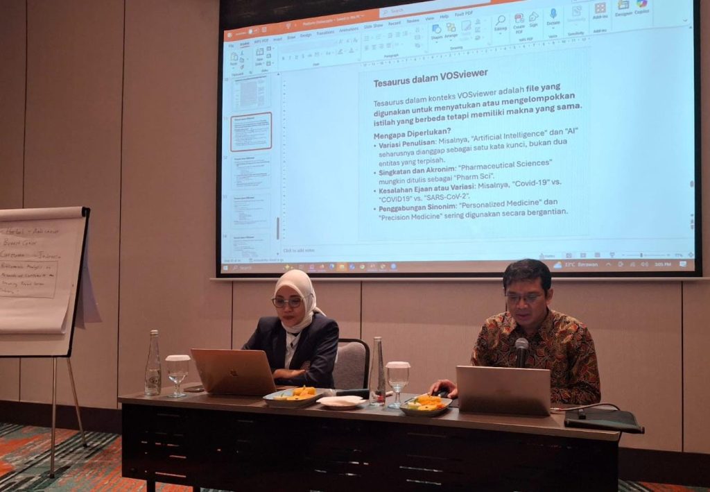 Narasumber kedua, Prof. Dr. apt. Agung Endro Nugroho., S.Si, M.Si selaku Guru Besar dari Fakultas Farmasi Universitas Gadjah Mada Yogyakarta, hadir langsung di Lokasi dan menyampaikan materi terkait “Pelatihan Riset Bibliometrik”.