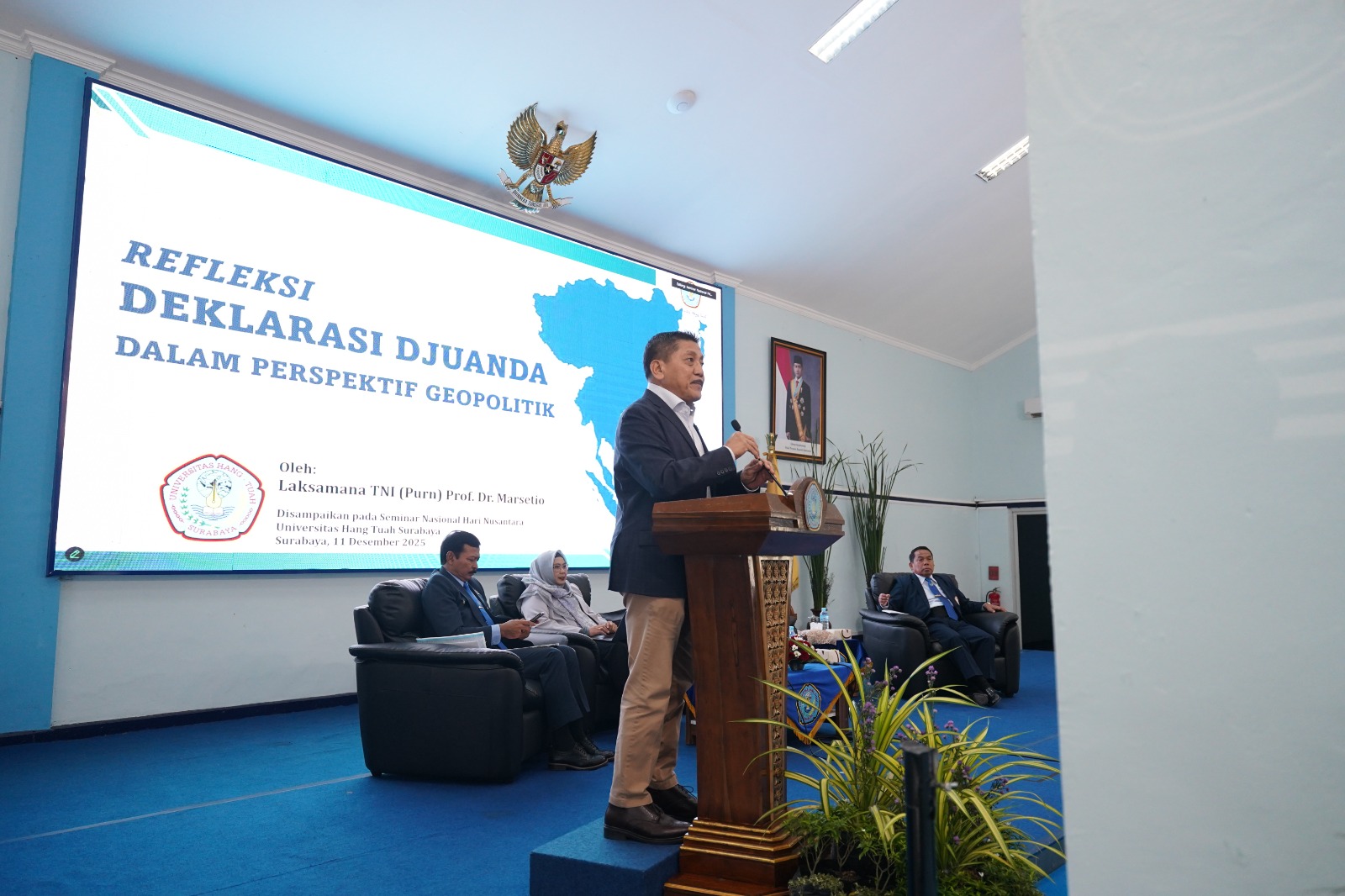 Seminar Nasional dengan tema “Menegakkan Kedaulatan Hukum Laut Indonesia: Refleksi 68 Tahun Deklarasi Djuanda” ini menghadirkan para narasumber yang mumpuni di bidang pertahanan, maritim, dan hukum nasional. Antara lain Laksamana TNI (Purn) Prof. Dr. Marsetio, S.I.P., M.M., Penasehat Khusus Mendikbudristek (Refleksi Deklarasi Djuanda dalam Perspektif Geopolitik). Laksamana Muda TNI (Purn) Dr. Iwan Isnurwanto, S.H., M.A.P., M.Tr.Han., Wakil Rektor II UHT (Refleksi dari Perspektif Keamanan Laut), serta Prof. Dhiana Puspitawati, S.H., LL.M., Ph.D., Dosen Fakultas Hukum Universitas Brawijaya (Refleksi dari Perspektif Pembangunan Hukum Nasional).