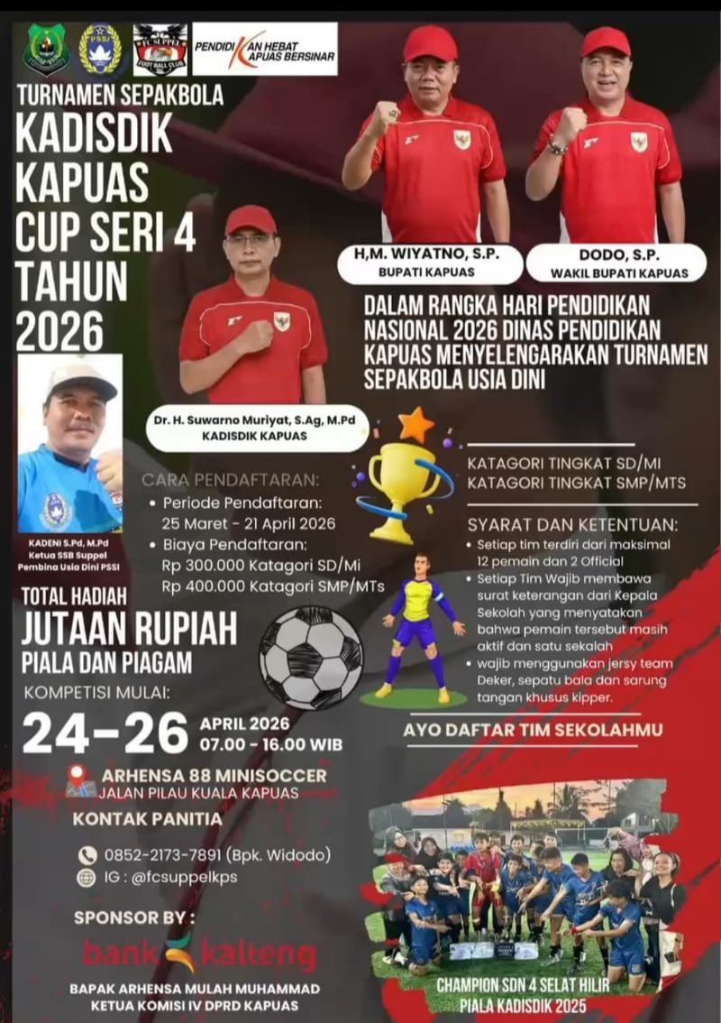 KUALA KAPUAS,Rajawali1news.com – Pemerintah Kabupaten Kapuas melalui Dinas Pendidikan resmi menggelar Turnamen Sepak Bola Usia Dini Piala Kadisdik Kapuas Seri IV Tahun 2026, yang dibuka langsung oleh Bupati Kapuas H. Muhammad Wiyatno di Stadion Panunjung Tarung Kuala Kapuas, Jumat (24/4/2026) pagi.